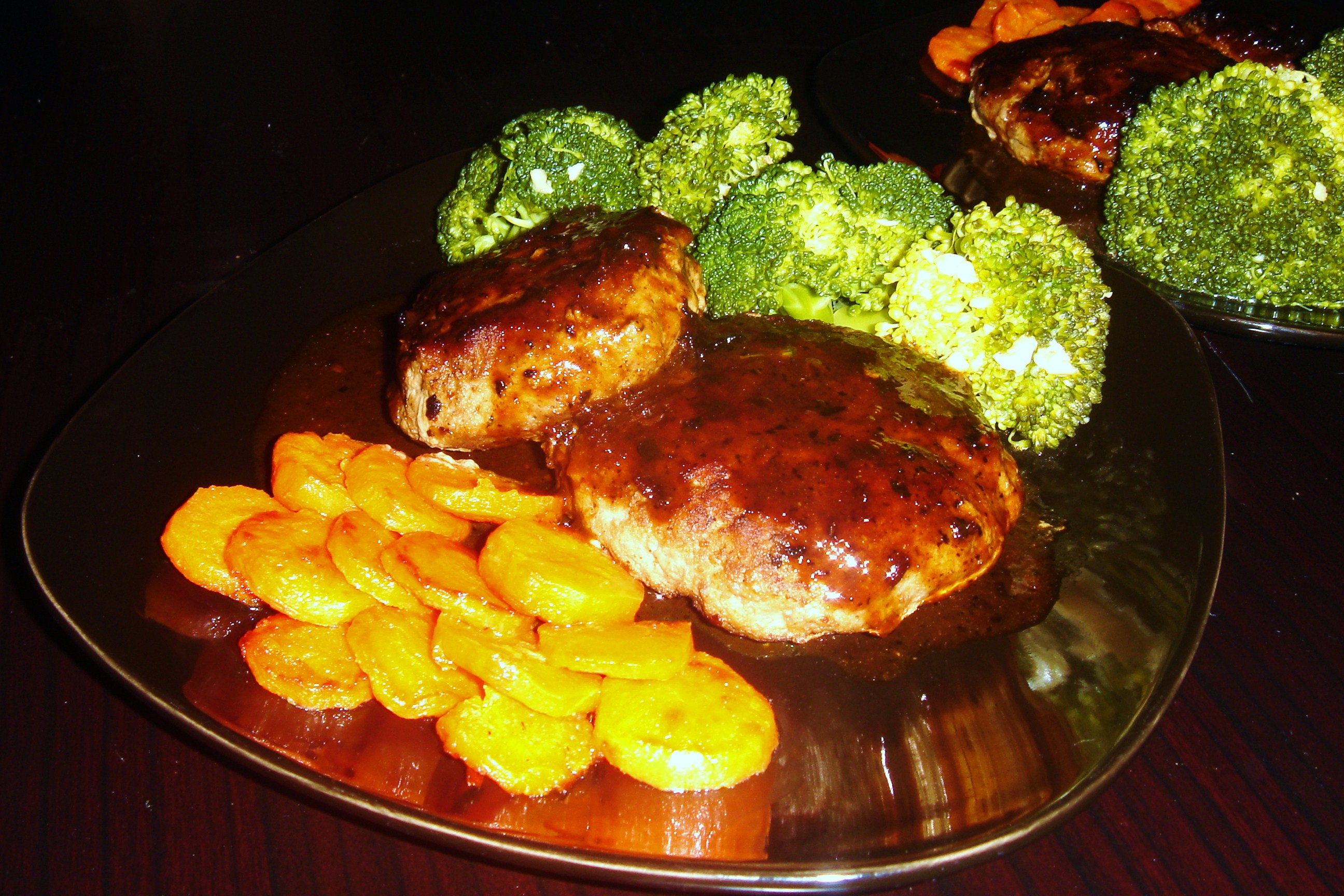 Savory Japanese Hamburg Steak pan fried with olive oil and topped with home made gravy sauce, garnished with butter sauteed carrots and boiled garlic broccoli.